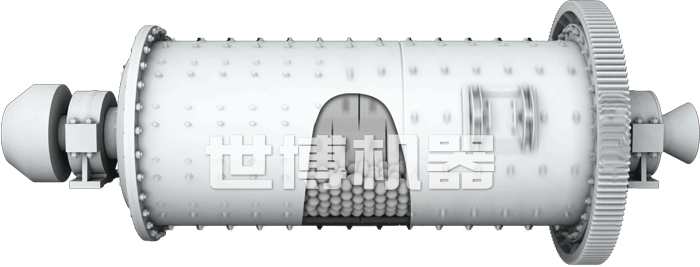 本球磨机为卧式筒形旋转装置,外沿齿轮传动,两仓,格子型球磨机。由给料部、出料部、回转部、传动部(减速机,小传动齿轮,电机,电控)等主要部分组成。 物料由进料装置经入料中空轴螺旋均匀地进入磨机第一仓,该仓内有阶梯衬板或波纹衬板,内装各种规格钢球,筒体转动产生离心力将钢球带到一定高度后落下,对物料产生重击和研磨作用。物料在第一仓达到粗磨后,经单层隔仓板进入第二仓,该仓内镶有平衬板,内有钢球,将物料进一步研磨。粉状物通过卸料箅板排出,完成粉磨作业。