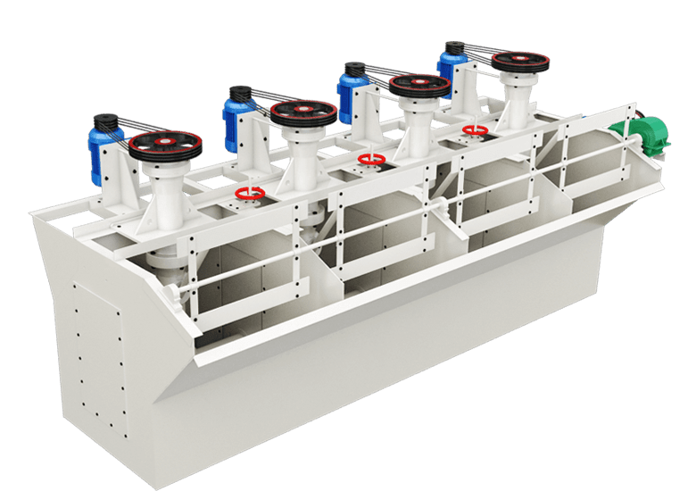 浮选机的叶轮带有后倾式双面叶子,可实现槽内矿浆双循环,有利于粗粒矿物悬浮。